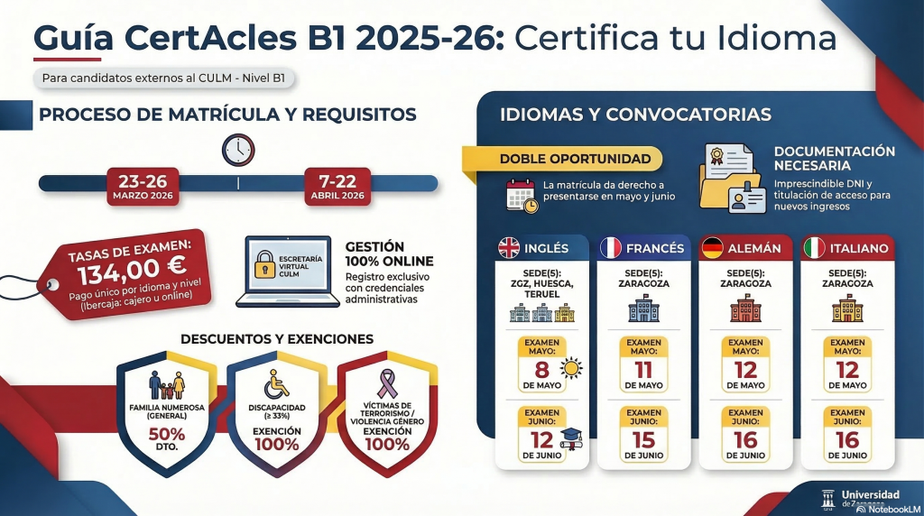 La superación del nivel B1 de Inglés, Francés, Alemán o Italiano del CULM, permite solicitar el reconocimiento de créditos de la asignatura Idioma moderno B1 del Grado en que el alumno esté matriculado en la Universidad de Zaragoza. Para ello, deberá dirigirse a la secretaria de su centro, donde le facilitarán las instrucciones al respecto. Asimismo también permite el acceso a los Másteres, como por ejemplo, el Master de Profesorado impartido en la Facultad de Educación, y la acreditación del nivel en Programas de Movilidad.